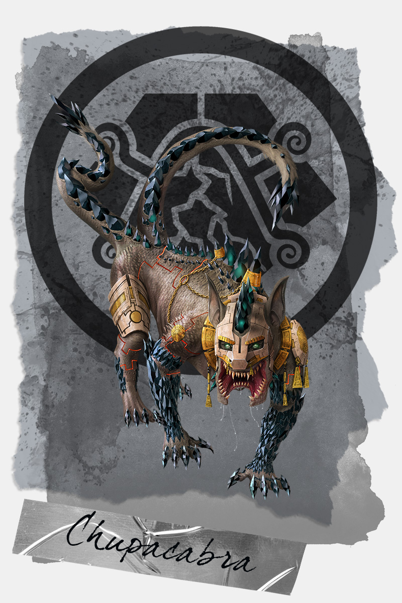 Der Chupacabra, ein furchterregendes Wesen und ein Chumul'Ahm, entsprang den Experimenten der Xulun Chuaq, die die Kräfte mehrerer Wildtiere in einem einzigen, tödlichen Körper vereinten. Dieses Ungeheuer wurde aus den stärksten und gefährlichsten Kreaturen des Dschungels erschaffen – seine Zähne sind scharf wie die eines Jaguars, seine Sinne so geschärft wie die eines Adlers, und seine Geschwindigkeit übertrifft die eines Pumas. Der Chupacabra wurde gezüchtet, um ein unerbittlicher Jäger zu sein, der seine Beute lautlos verfolgt und im Schatten zuschlägt. Dieses Geschöpf ist nicht nur eine Waffe, sondern auch ein Symbol für die düstere Macht der Xulun Chuaq, die bereit sind, die Natur selbst zu formen, um ihre Feinde zu vernichten. Der Chupacabra wird mit Ehrfurcht und Schrecken betrachtet, ein lebendiges Zeugnis der dunklen Künste und der unheiligen Fusion von Tier und Magie.