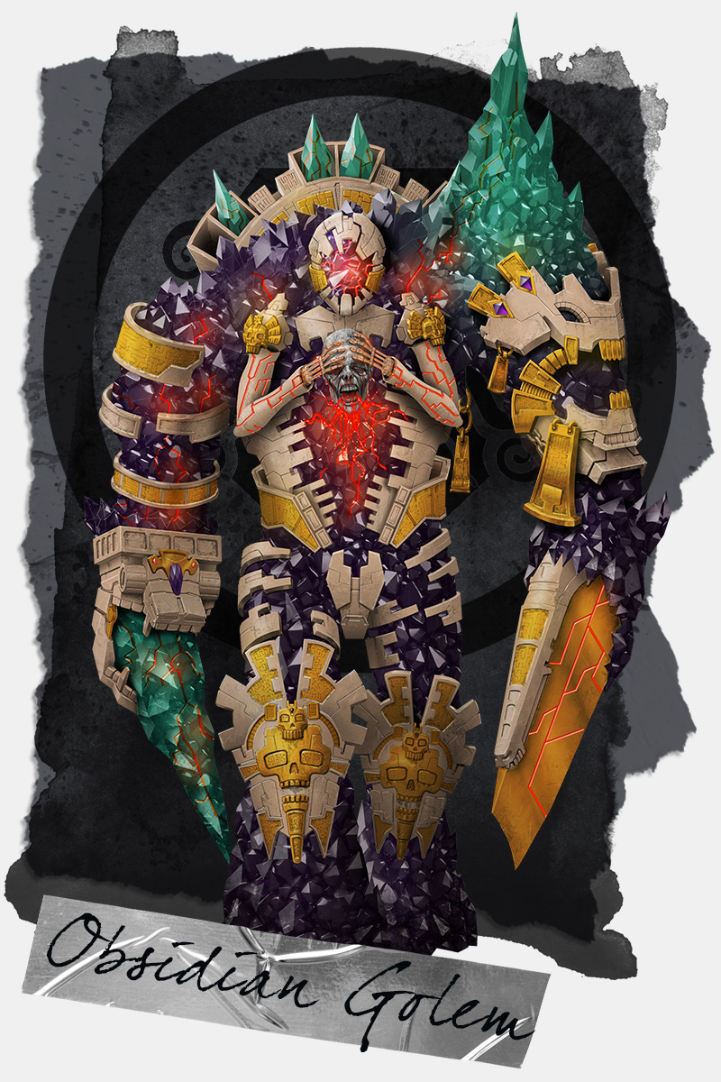 Der Obsidiangolem gleicht einem lebenden Bollwerk, dessen massiver Körper seinen Verbündeten in unmittelbarer Nähe signifikanten Schutz vor feindlichem Beschuss bietet. Für seine Feinde ist er nicht nur ein furchteinflößender Anblick, sondern seine besondere Beschaffenheit ermöglicht ihm auch, Schäden an sich selbst zu reparieren. Darüber hinaus kann der Golem Obsidiansplitter sowohl im normalen Fernkampf als auch über große Distanzen wie Artilleriegeschosse auf seine Feinde regnen lassen, was ihn zu einer gefährlichen und vielseitigen Einheit macht.