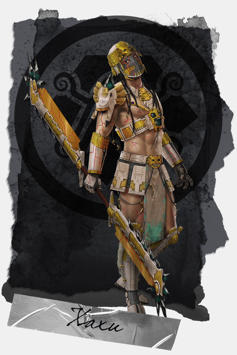 Xaxu, ein gefürchteter Krieger der Balacham, wuchs als Sohn einfacher Icnun-Bürger auf, die ihm wenig mehr als ein schlichtes, aber ehrliches Leben vorlebten. Doch in Xaxu brannte von klein auf ein unstillbarer Ehrgeiz, mehr zu erreichen. Angetrieben von einem tiefen inneren Drang, der fast schon fanatisch war, verbrachte er unzählige Stunden im Dschungel, wo er seine Reflexe schärfte und die Kunst erlernte, sich lautlos zu bewegen und blitzschnell zuzuschlagen. Durch seine außergewöhnlichen Errungenschaften wurde er schließlich in die Obhut der Balacham aufgenommen, wo er sich durch Disziplin und Entschlossenheit einen Namen machte. Seine bevorzugte Waffe, der "Balam Xik" („Jaguar-Klaue“), eine Stabwaffe mit zwei Schneiden, verstärkt durch mächtige Obsidiankristalle, ist das Symbol seiner Wildheit und Stärke im Nahkampf. Xaxus unermüdlicher Wille, seine Fähigkeiten immer weiter zu verbessern, und seine tiefe Verbindung zur Wildnis machen ihn zu einer außergewöhnlichen Kraft unter den Balacham, gefürchtet und respektiert gleichermaßen.