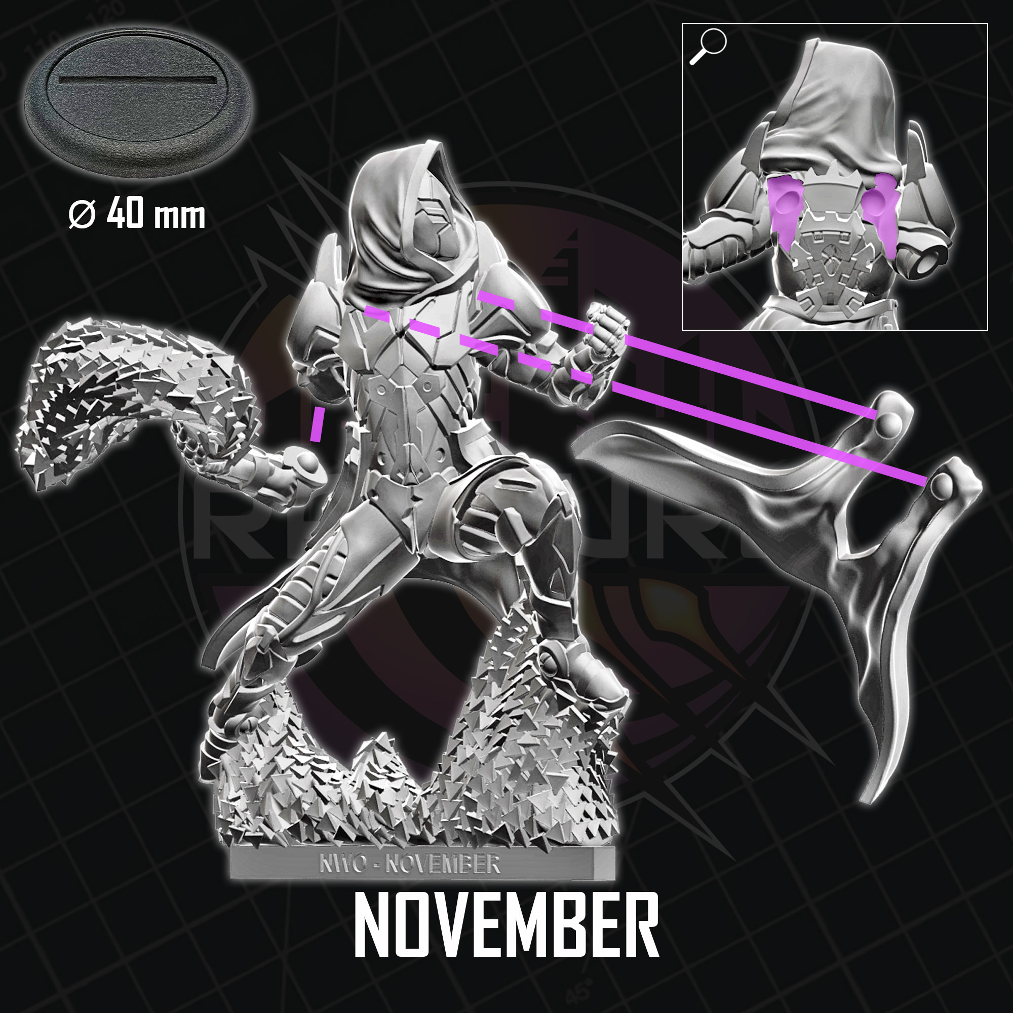 November ist das Ergebnis des geheimsten und ambitioniertesten Projekts der New World Order: dem Executive-Programm, basierend auf den uralten Forschungen von Adam Weishaupt, dem Urvater der Illuminaten und der NWO, über Magie, Manipulation und metaphysische Kontrolle. Die Illuminati Executives sind eine Eliteeinheit, ausgewählt aus den vielversprechendsten Kognitarchen Homo Psiensis – Menschen mit außergewöhnlichen Begabungen und übermenschlicher Kontrolle über das Unsichtbare. Verstärkt durch Magie, Genetik und kybernetische Disziplin sind sie keine gewöhnlichen Soldaten oder Agenten mehr, sondern die perfekten Instrumente der New World Order. November war nicht der Erste in der Reihe der Executives, aber der reinste Erfolg. Während Oscar als instabil galt und Bravo zu unabhängig war, erwies sich November als effizient, emotionslos, tödlich. Er manipuliert das Hier und Jetzt, kann innerhalb von Millisekunden an einem anderen Ort auftauchen. Seine Fertigkeiten basieren nicht auf der bloßen Kunst der Energieformung – er zerlegt Magie und setzt sie ebenso elegant wie tödlich wieder zusammen. Bekannt sind seine Einsätze gegen Gesetzlose, Engel und konkurrierende Geheimgesellschaften. Gerüchte erzählen von einem Vorfall in Prag: Eine ganze Loge der Civitas Dei wurde in 17 Minuten ausgelöscht – keine Überlebenden, keine Zeugen, keiner sprach darüber. Nur die für November typischen Dreiecke waren in alle Wände eingebrannt. Er spricht selten und zeigt keine Emotionen – nur die eiskalte und fehlerlose Effizienz zählt, immer fokussiert auf die Mission und das größere Wohl der New World Order.